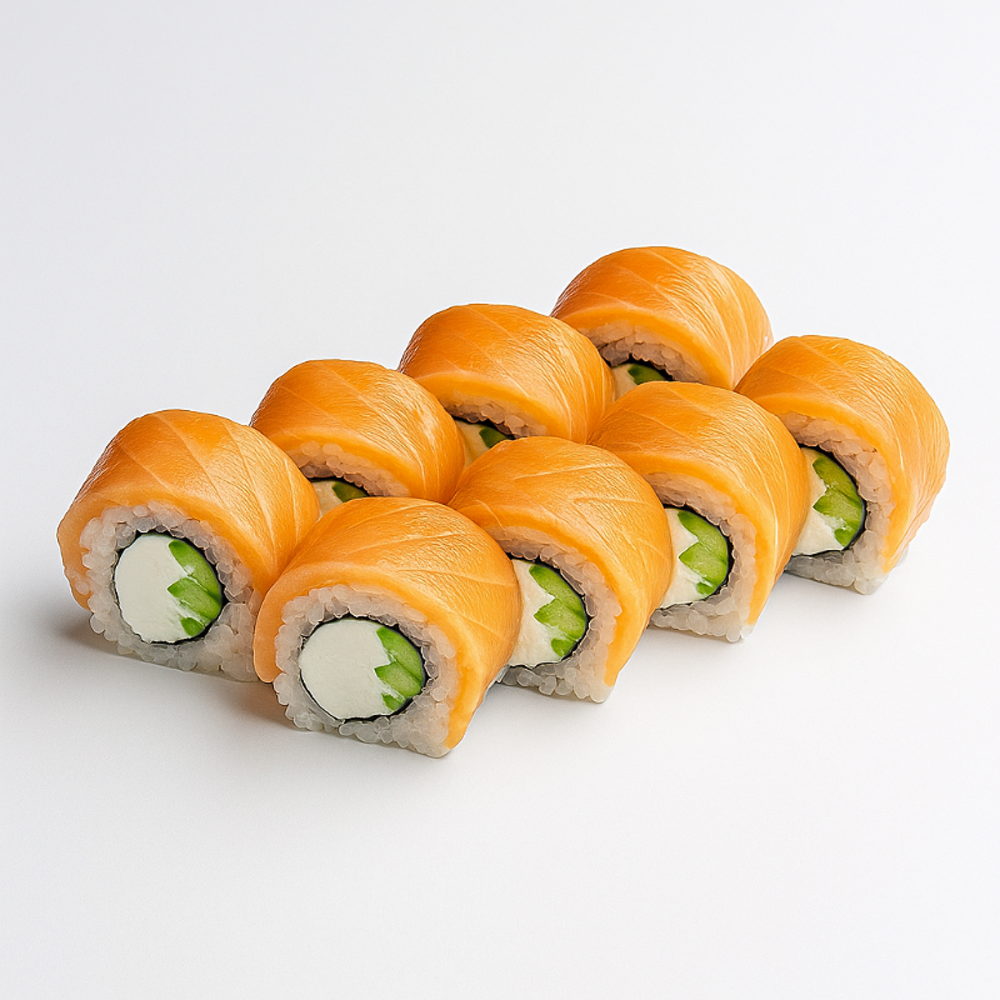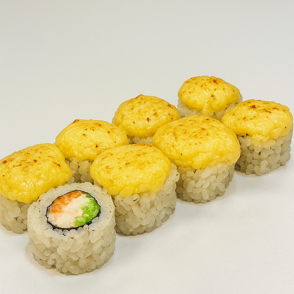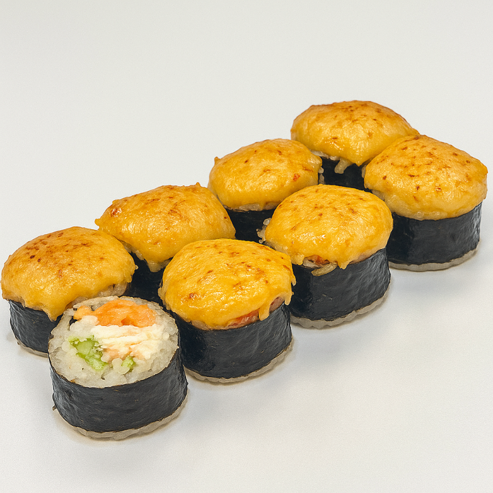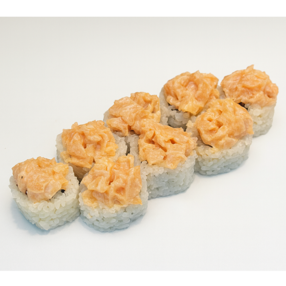 - Nori, rice, cream cheese, cucumber, salmon, cheese Gauda, spice sauce
