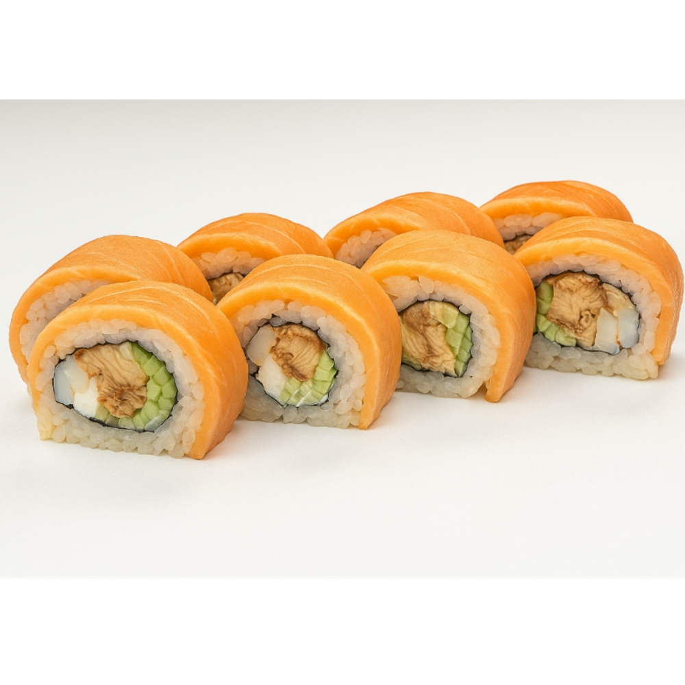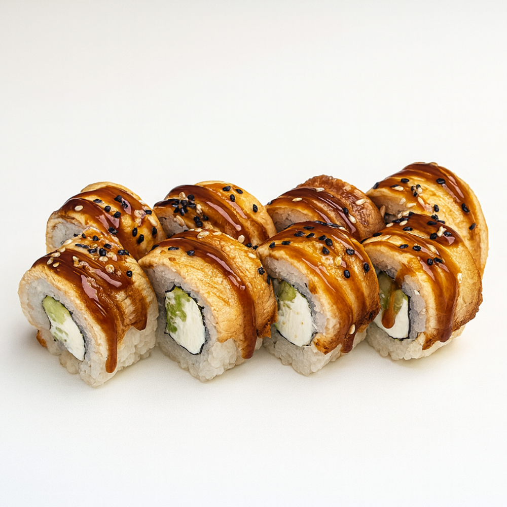 - Nori, rice, cream cheese, cucumber, eel, ugani sauce , sesame