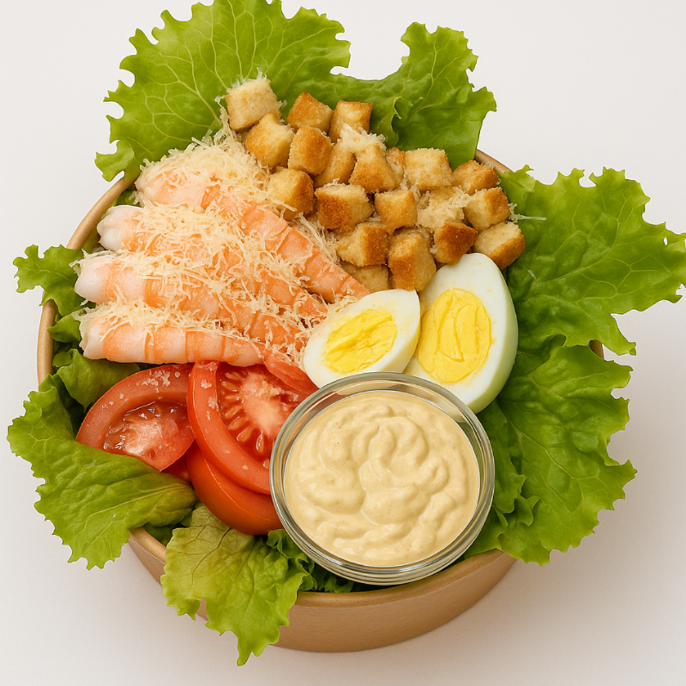 - Lettuce, shrimp, egg, Suchari, tomato, Parmesan cheese , Caesar sauce