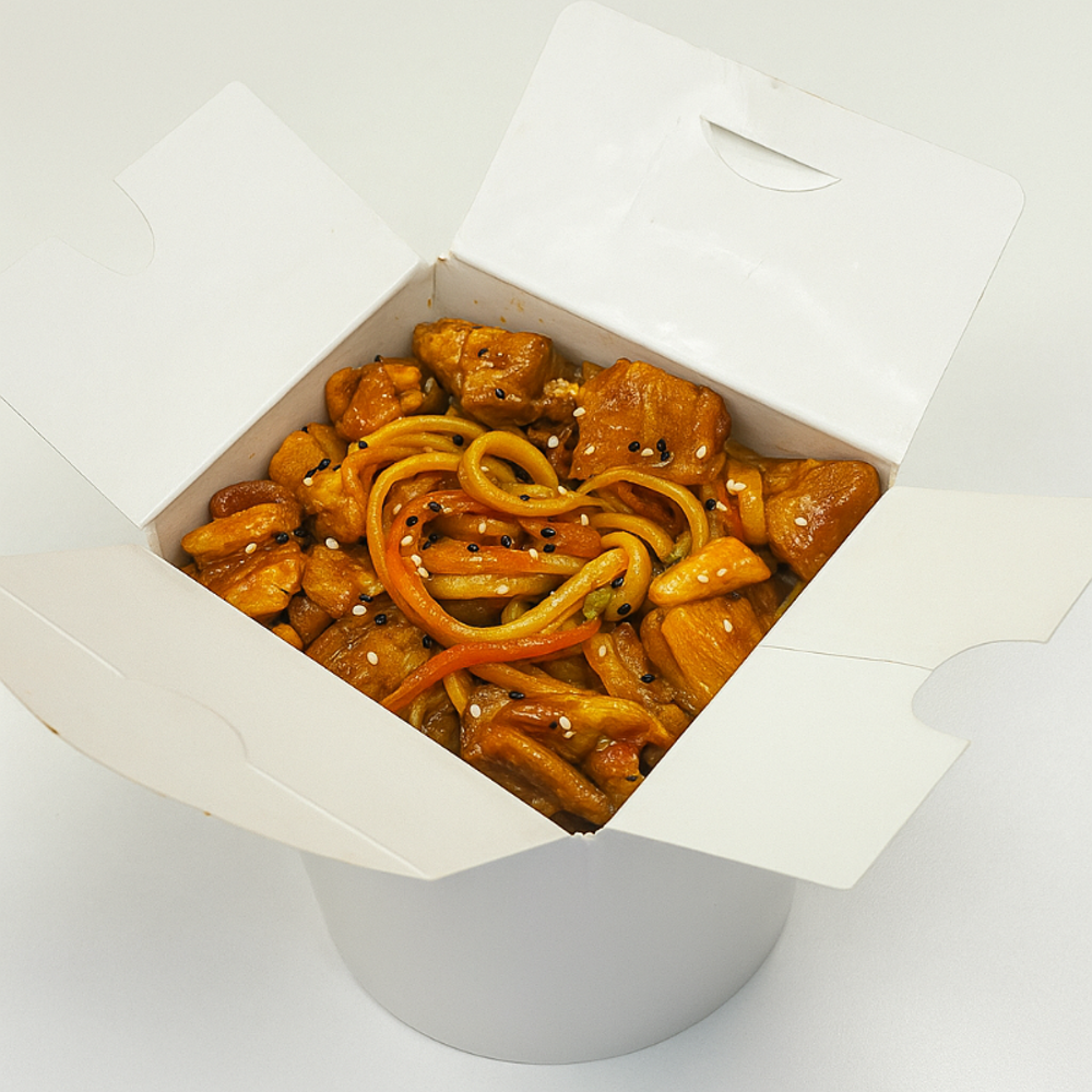 - Noodles, carrots, zucchini , bell peppers, onions, red onions, green onions , sesame, chicken