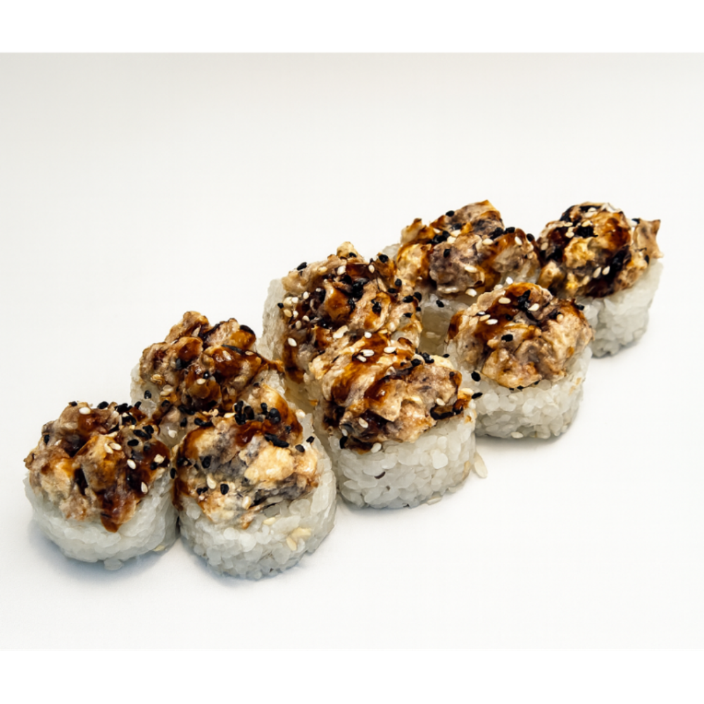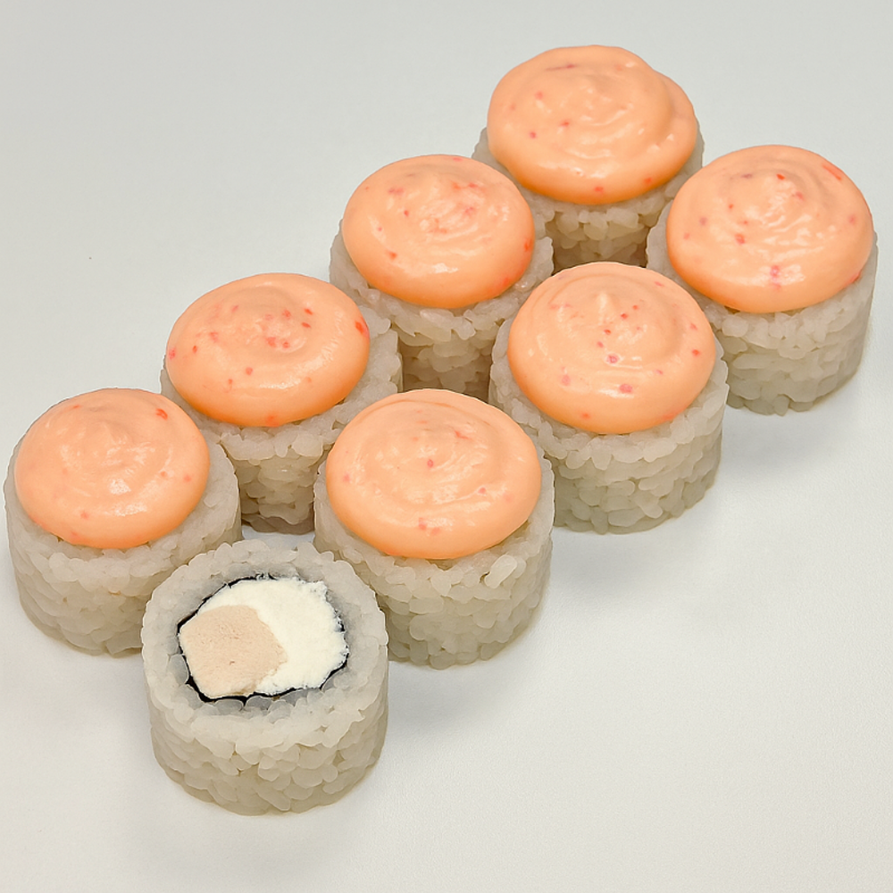 - Nori, rice, cream cheese, cucumber, chicken, cheese Gauda, spice sauce